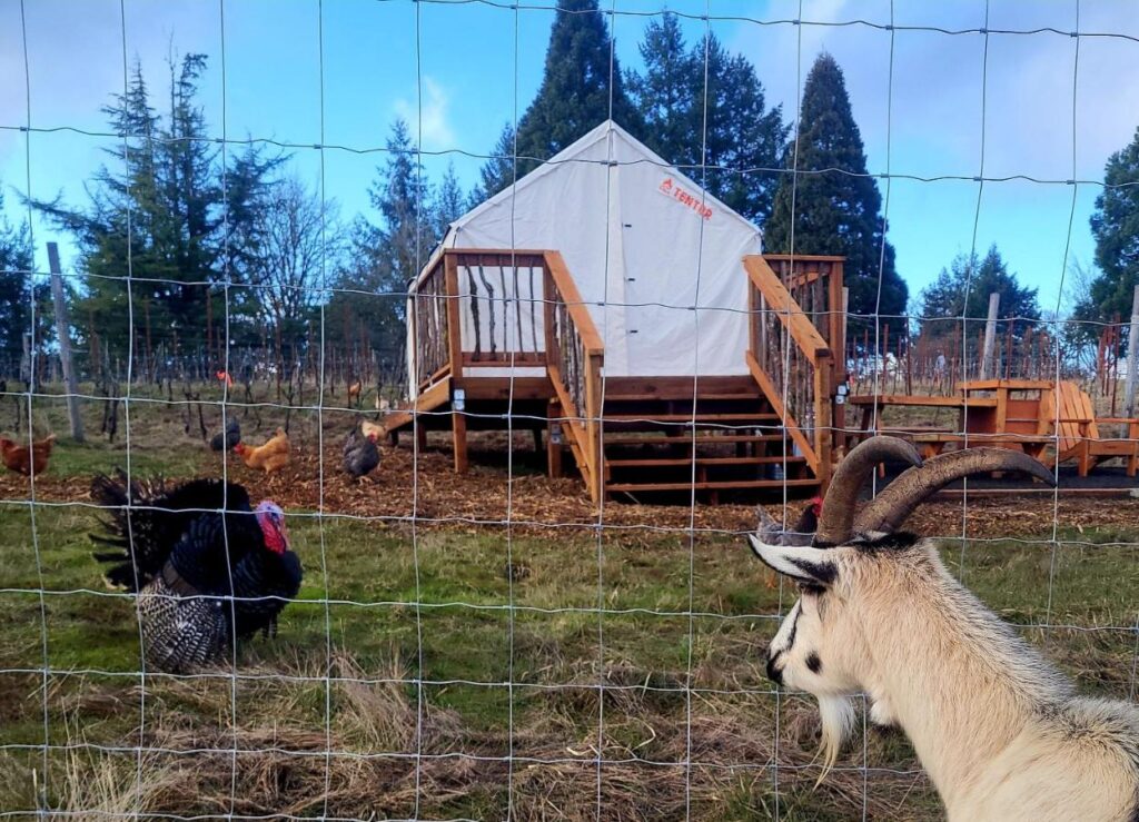 Home base of WestSide Goat Girl, LLC – an environmentally friendly goat brush clearing business invites guests to glamp in a small 1-acre vineyard of Pinot Noir grapes on the top of a hill with fantastic views…. and goats! Dogs are allowed on this farm but must be leashed at all times for the safety of the farm animals.