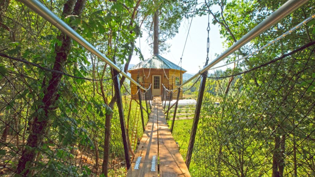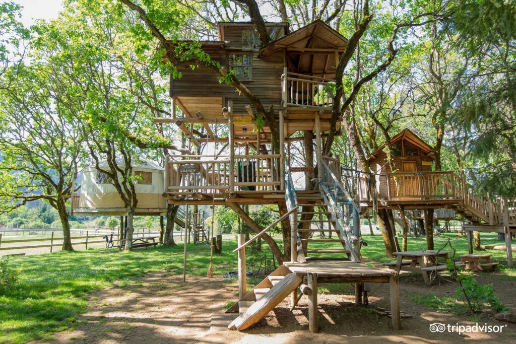 The largest collection of Treehouses available to stay in! This amazing spot is nestled into the Illinois Valley in Southwest Oregon. Not only can you “glamp” among the tree branches, you can ride horses, zip line or take a short drive to visit The Oregon Caves National Monument or the Redwoods. You have to see this to believe how much creativity and loving fun energy is afoot here. Book your stay online direct with Out n About.
