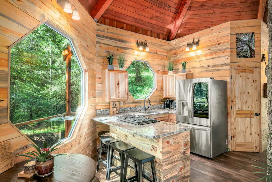 This very private treehouse is in a secluded forest setting with nothing but the sounds of birds and a nearby waterfall. Book Online to experience a full recharge in nature.